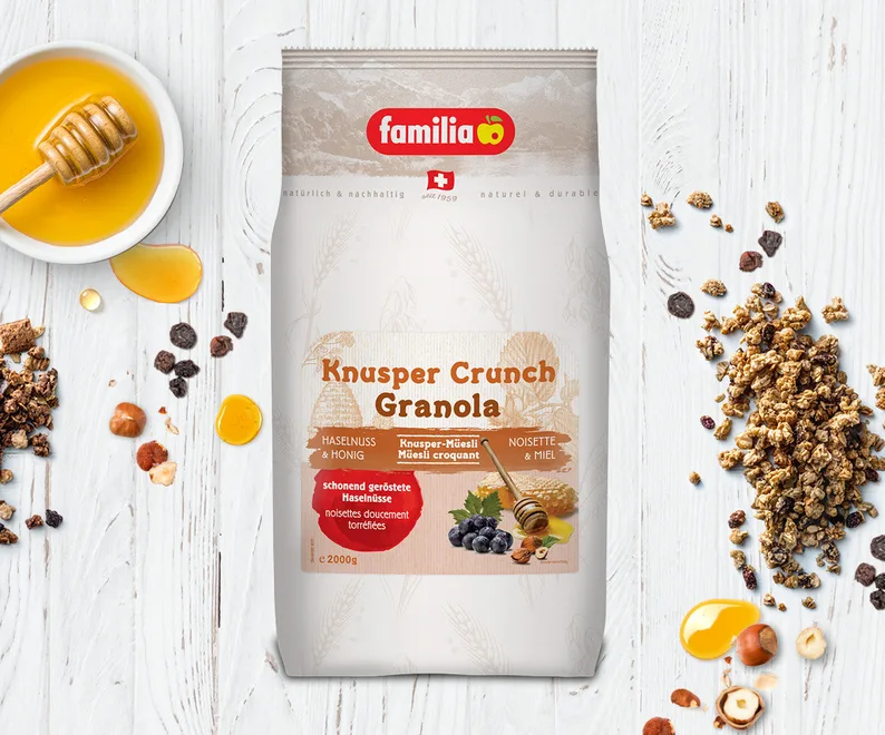 Der Klassiker unter den Knuspermüesli. familia Knusper Crunch verwöhnt Sie mit geschmackvollen Haselnüssen, feinstem Honig, mitgebackenen Rosinen und wertvollem Vollkorn. Die Nüsse werden bei uns von Hand verlesen und nach traditioneller Art schonend geröstet. Das Knuspermüesli verleiht Ihnen Schwung und Energie für den ganzen Tag.