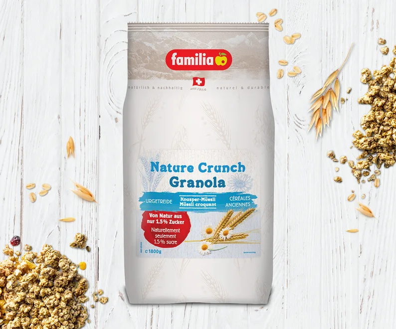 Das Knuspermüesli familia Nature Crunch mit Urgetreide und wertvollem Vollkorn-Hafer ist reich an Nahrungsfasern und enthält von Natur aus nur 1.5 % Zucker.