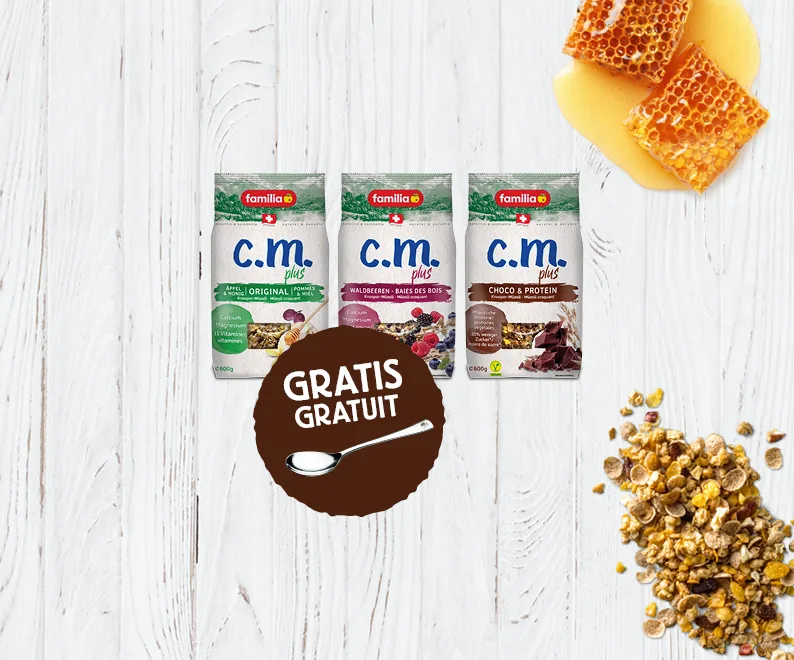 Das Knuspermüesli familia c.m.plus enthält Calcium, Magnesium sowie zehn Vitamine. Eine ausgewogene Ernährung mit Calcium, Magnesium und Vitaminen, kombiniert mit genügend Bewegung, trägt massgeblich zu deinem Wohlbefinden bei. familia c.m.plus ist das persönliche Plus, das dich von klein auf bis ins hohe Alter täglich begleitet.