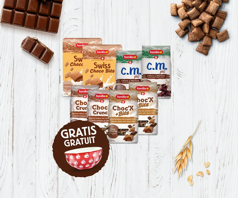 Diese Box ist perfekt für alle Schokoladen-Liebhaber, die auch am Morgen nicht auf Schokolade verzichten möchten! Hier hast du eine Auswahl an familia Müesli mit feinster Schokolade. Du bleibst deinem Lieblingsgeschmack treu und hast doch Abwechslung zum Frühstück.