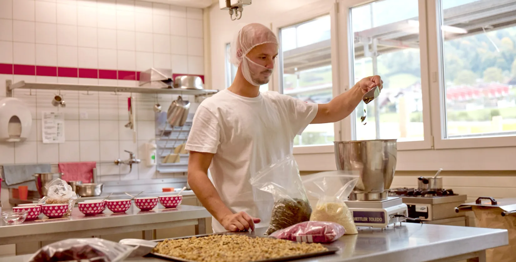 Was nur wenige wissen: hinter den modernen Produktionsanlagen liegt ein stiller Raum – unsere kleine «Gnuss-Wärkstatt». Hier tüftelt ein kleines Team mit viel Liebe zum Detail an neuen Müesli-Ideen. Sie mischen von Hand, probieren, riechen, backen wie in alten Zeiten – und zaubern aussergewöhnliche Kreationen für die «Gnuss-Wärkstatt».