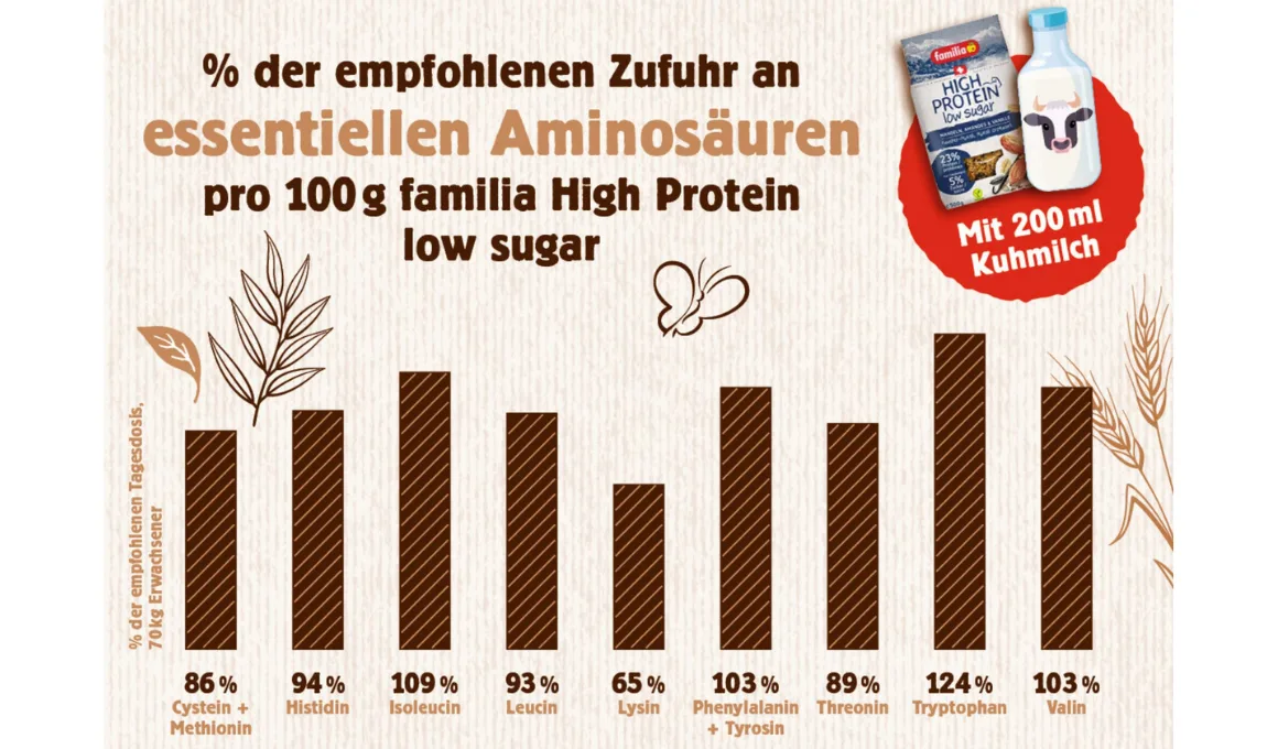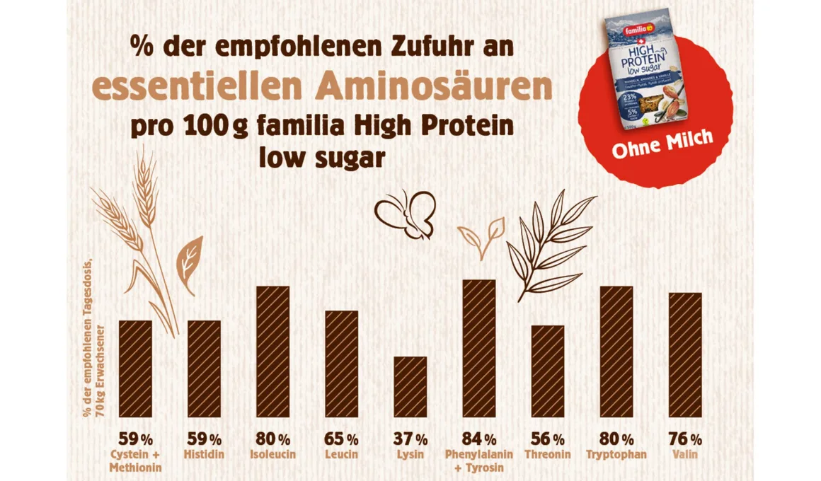 Eine Schüssel High Protein low sugar mit oder ohne Milch bietet eine ausgewogene Protein-Zusammensetzung: Alle neun essenziellen Aminosäuren sind enthalten (siehe Aminosäurenprofile, Grafik 1 (mit Milch) und Grafik 2 (ohne Milch). Essenziell heisst, dass die Aminosäuren mit der Nahrung zugeführt werden müssen und nicht vom Körper selbst hergestellt werden können. Die Aminosäure Lysin ist beim High Protein low sugar in geringster Menge vorhanden, was typisch für ein Getreideprodukt ist.