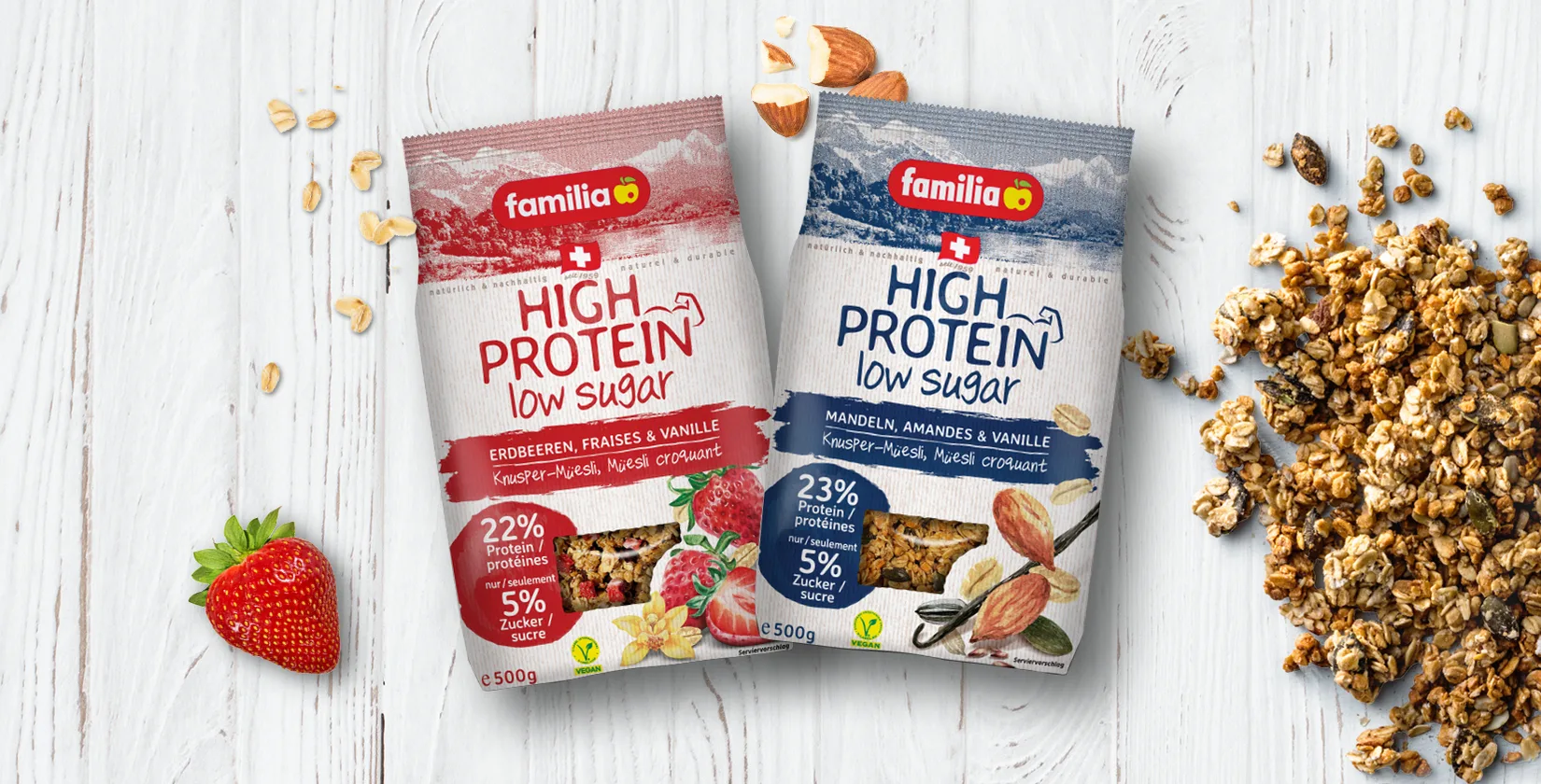 Das Protein im High Protein low sugar Knuspermüesli stammt aus dem enthaltenen Getreide, den Hülsenfrüchten sowie Nüssen, Samen und Kernen. Im Spezifischen aus Hafer, Weizen, Erbsen, Mandeln, Leinsamen sowie Sonnenblumen- und Kürbiskernen.