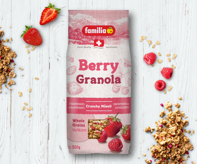 Vollkorn-Haferflocken, Dinkelflakes (Dinkel, Zucker, Salz, Gerstenmalz), Rohzucker, Cerealien-Crispies (Mais, Reis, Rohzucker, Vollkornmehl (Weizen, Roggen, Gerste), Gerstenmalz, entöltes Kakaopulver, Salz), Sonnenblumenöl, Mehl (Weizen, Roggen), Kokosnussflocken, Weizenkeime, Traubenzucker, gefriergetrocknetes Himbeergranulat (Glukose, Zucker, Himbeeren 0,4 %, Verdickungsmittel Natriumalginate), gefriergetrocknetes Erdbeergranulat (Maltodextrin, Erdbeeren 0,25 %, Zucker, modifizierte Kartoffelstärke, Verdickungsmittel Natriumalginate), geröstete Haselnüsse, Honig, gefriergetrocknete Erdbeeren 0,5 %, Salz. Getreide: 65 %, davon Vollkorn: 86 %.