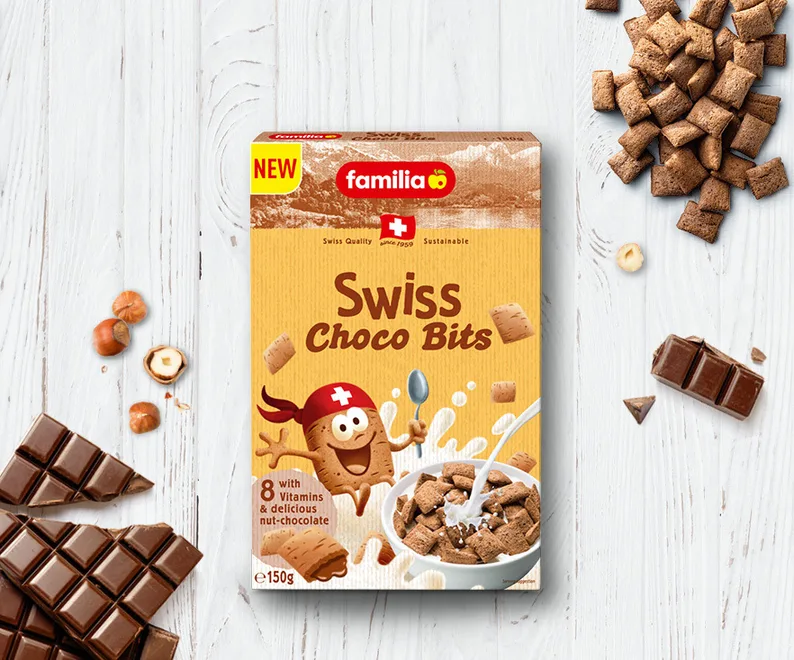 Geniesse unsere Familia Swiss Choco Bits, bestehend aus knusprigen Vollkorn-Müesli-Kissen mit einer zart schmelzenden Füllung aus Schweizer Schokolade.